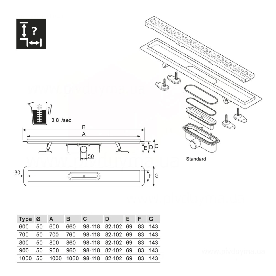 • Регулювання здійснюється за висотою - під час встановлення необхідно правильно вирівняти душовий канал за допомогою опорних ніжок та зафіксувати його на підставці.