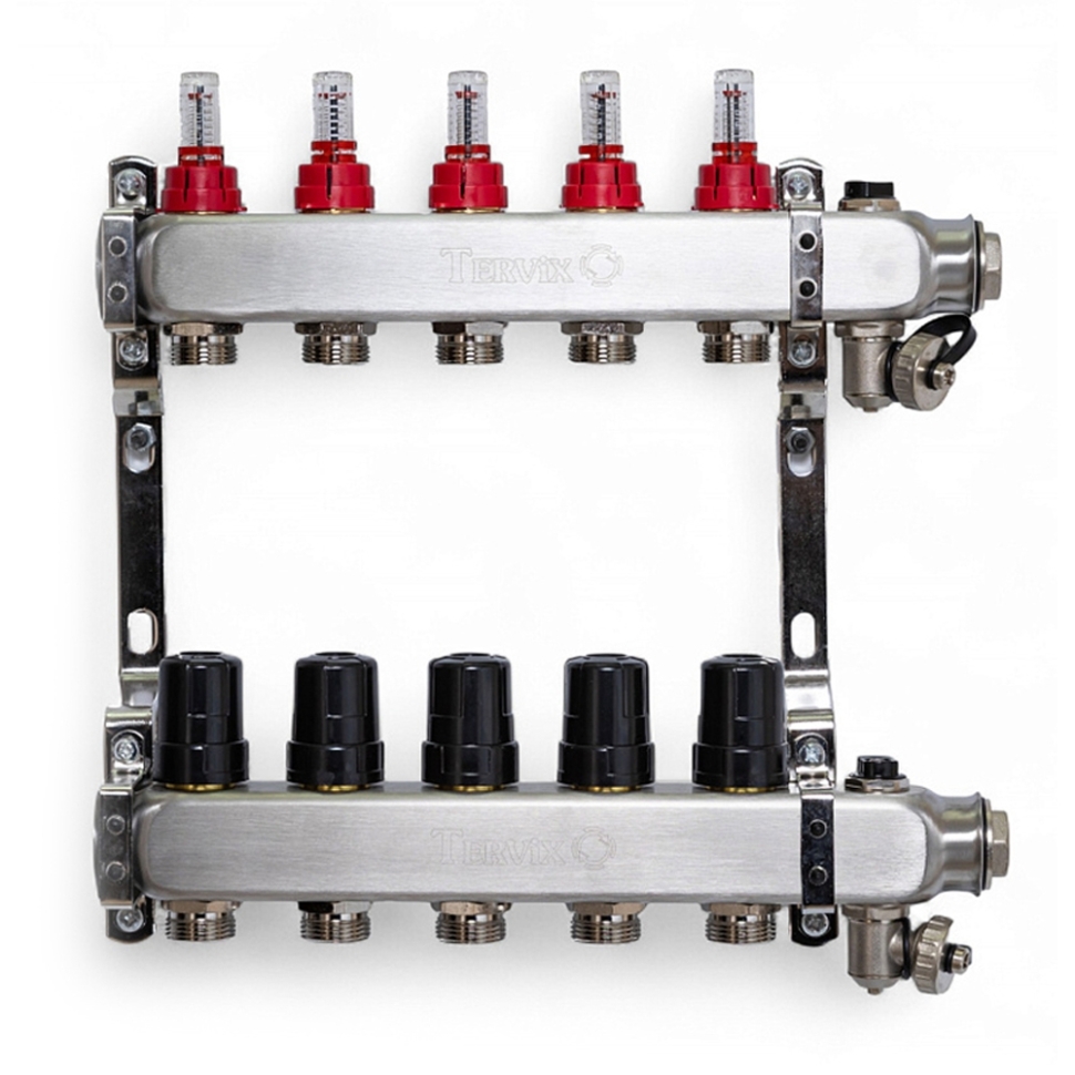Колектор на 5 контурів з витратомірами, краном Маєвського та зливним краном із нержавіючої сталі Tervix Pro Line