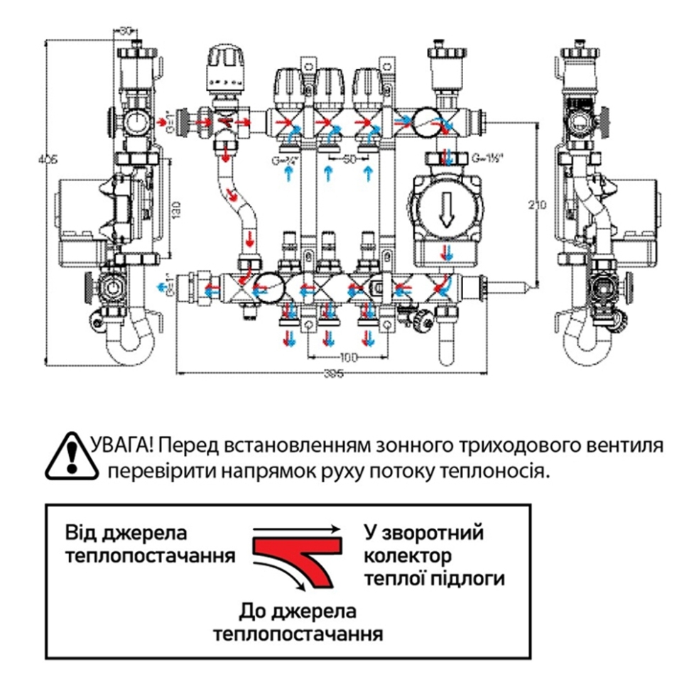 Виходи зворотного колектора блоку обладнані термостатичними, що подає – мікрометричними налаштувальними клапанами. Колектори оснащені повітровідвідниками з відсікаючими клапанами, дренажними кранами, пробками, що самоущільнюються. У комплект входять кріпильні кронштейни.