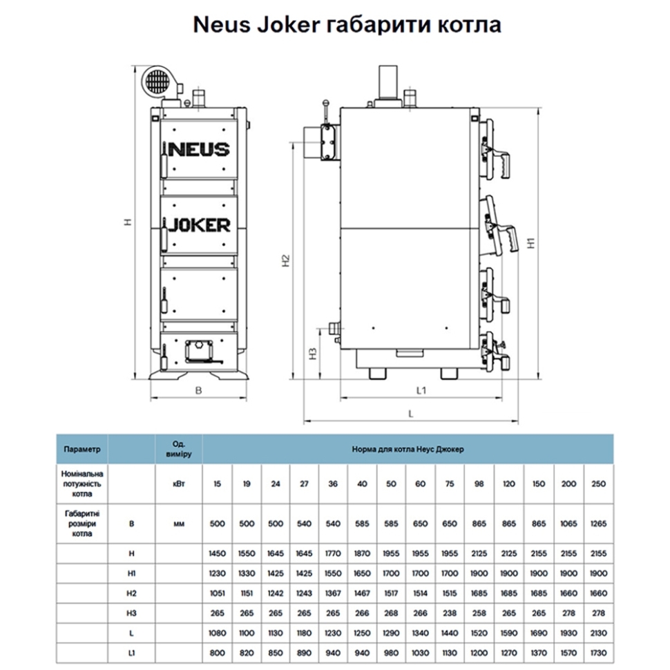| Параметр | Од. виміру | Норма для котла Неус Джокер | |||||