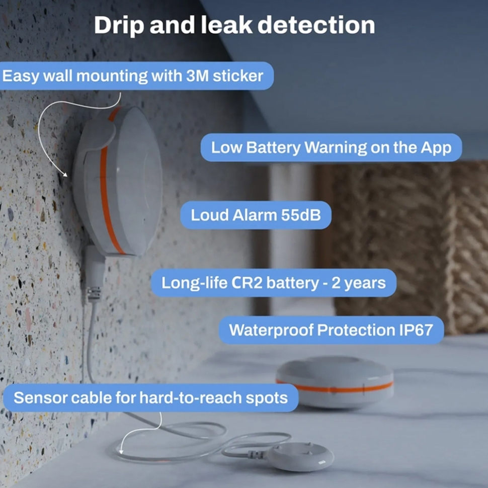 Бездротовий датчик виявлення витоку води. У разі виявлення протікання передає сигнал до клапану для закриття протоку води.
